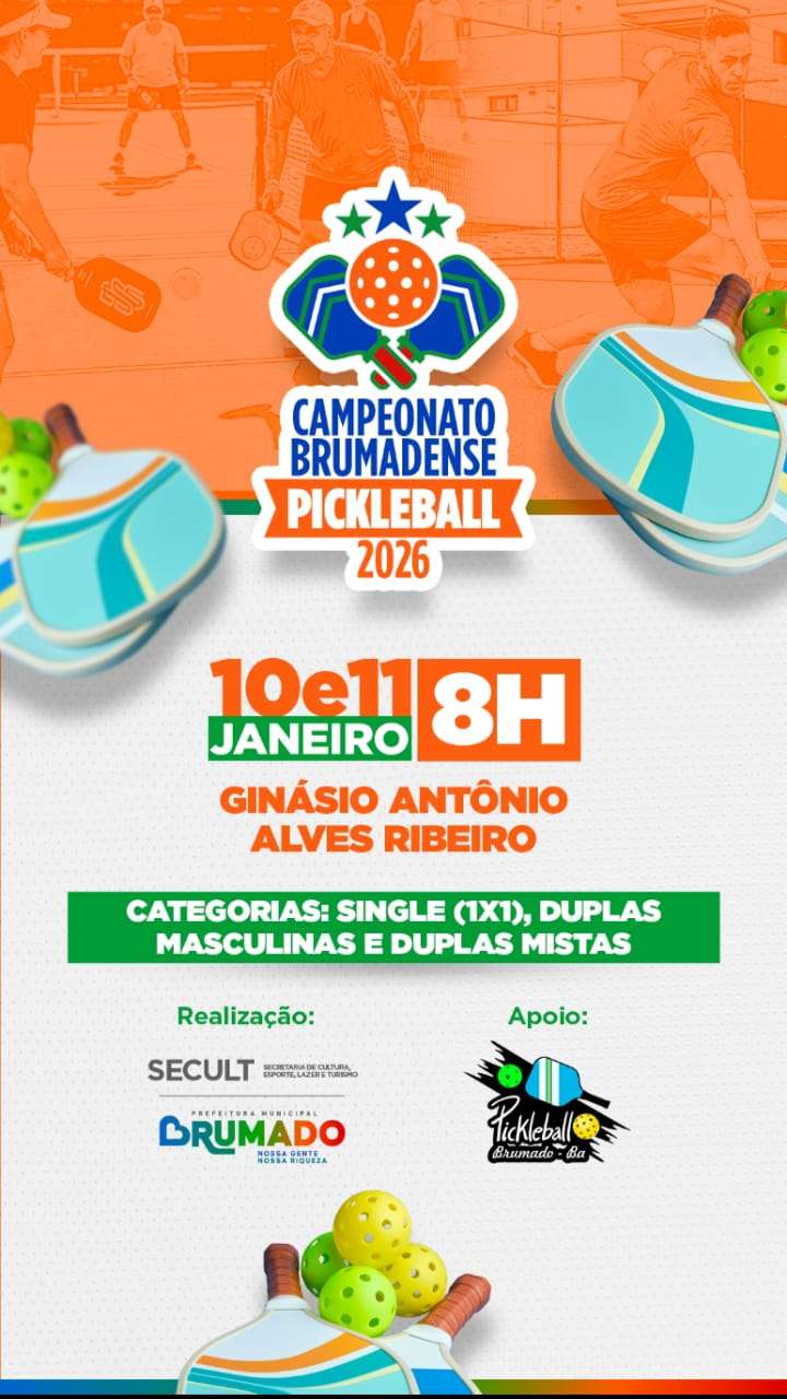 Neste sábado e domingo será realizado o primeiro Campeonato Brumadense de Pickleball organizado pela Prefeitura Municipal de Brumado, através da SECULT – Secretaria de Cultura, Esporte, Lazer e Turismo. O evento ocorrerá às das 08h às 12h, no Ginásio Antônio Alves Ribeiro. O torneio contará com as categorias individual (Single), duplas mistas e duplas masculinas.