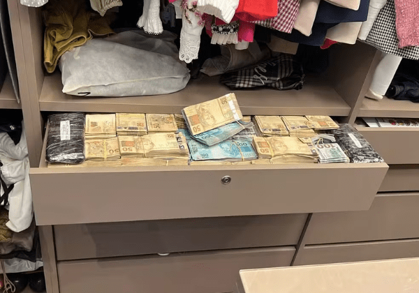 Durante o cumprimento das ordens judiciais, agentes encontraram gavetas abarrotadas de dinheiro em endereços ligados aos alvos da operação.